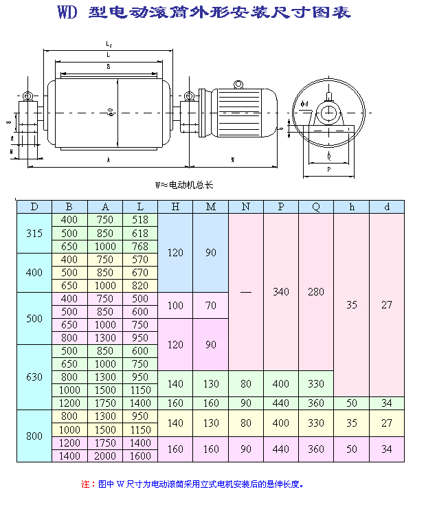 (1).因目前外裝式電動滾筒尚未制定相關(guān)行業(yè)標(biāo)準(zhǔn),本廠將該型號電動滾筒首位代號用W(“外裝”的首位漢語拼音)表示。外裝式電動滾筒外置電機(jī)可分為立式電機(jī)和臥式電機(jī),用戶訂購時請加以說明;